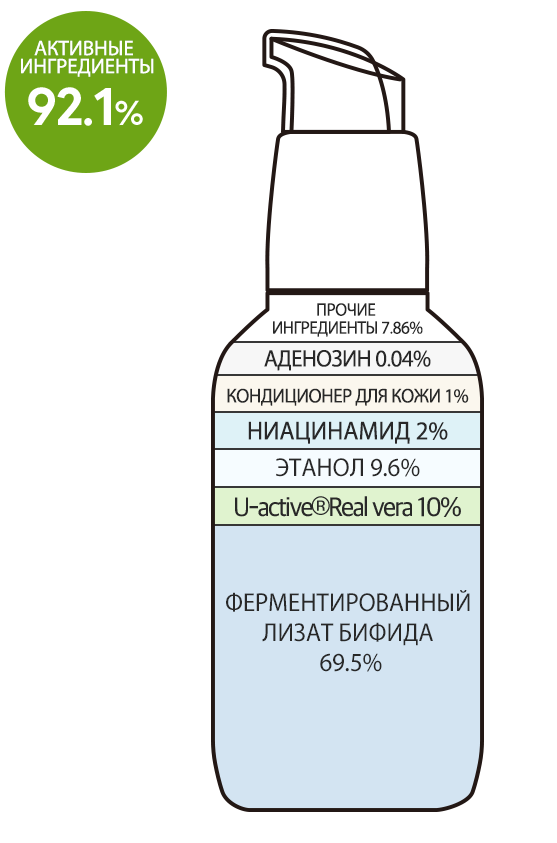 Состав: Bifida Ferment Lysate 69,5%, U-active®Real vera 10%, Ethanol 9,6%, Purified water 3%, 1,2-Hexanediol 1,9%, Niacinamide 2%, Isononyl Isononanoate 1%, Polyglyceryl-4 Caprate, Caprylic/Capric Triglycerides, Ammonium Acryloyldimethyl Taurate / Vp copolymer,Hydrolyzed Jojoba Ester, Ammonium Acryloyldimethyl Taurate / Vp copolymer, Acrylate/C10-30 Alkyl Acrylate Crosspolymer, Arginine, Ethylhexylglycerin, Adenosine, Disodium EDIT, Sodium Hyaluronate, Hydroxypropyltrimonium hyaluronate, Hydrolyzed Hyaluronic Acid, Sodium Acetylated Hyaluronate, Hyaluronic Acid, Hydrolyzed Sodium Hyaluronate, Sodium Hyaluronate Crosspolymer, Potassium Hyaluronate, Perfume
