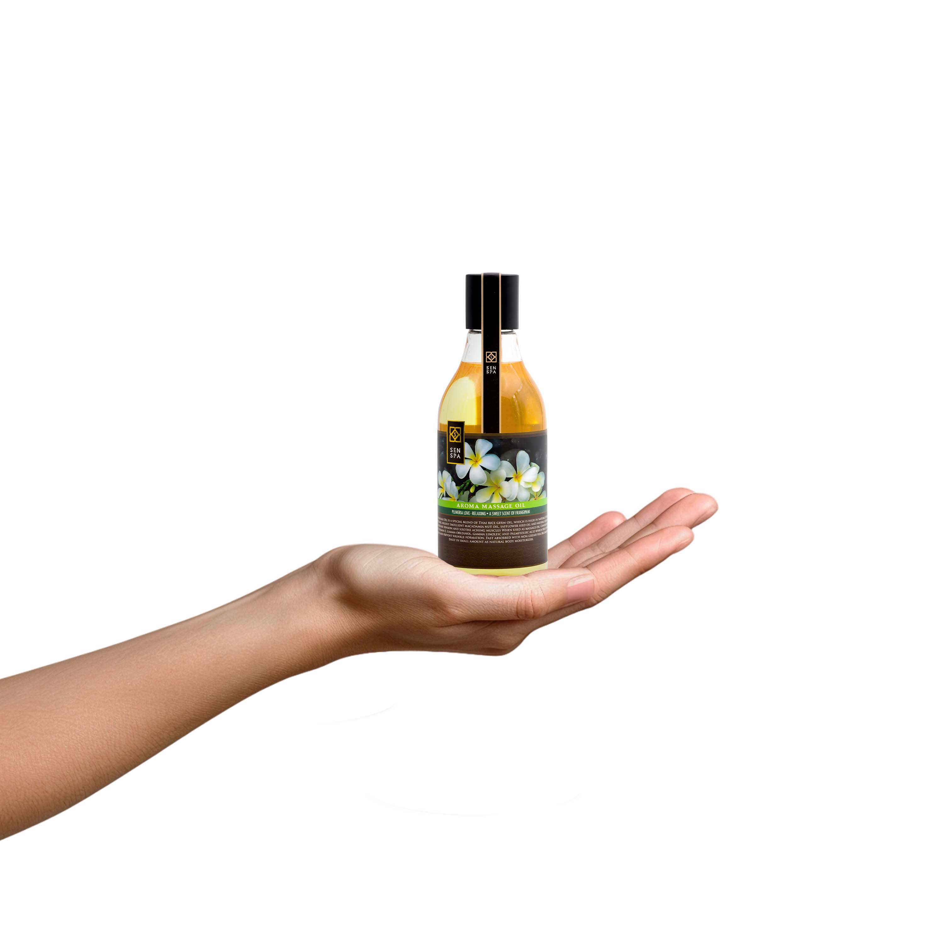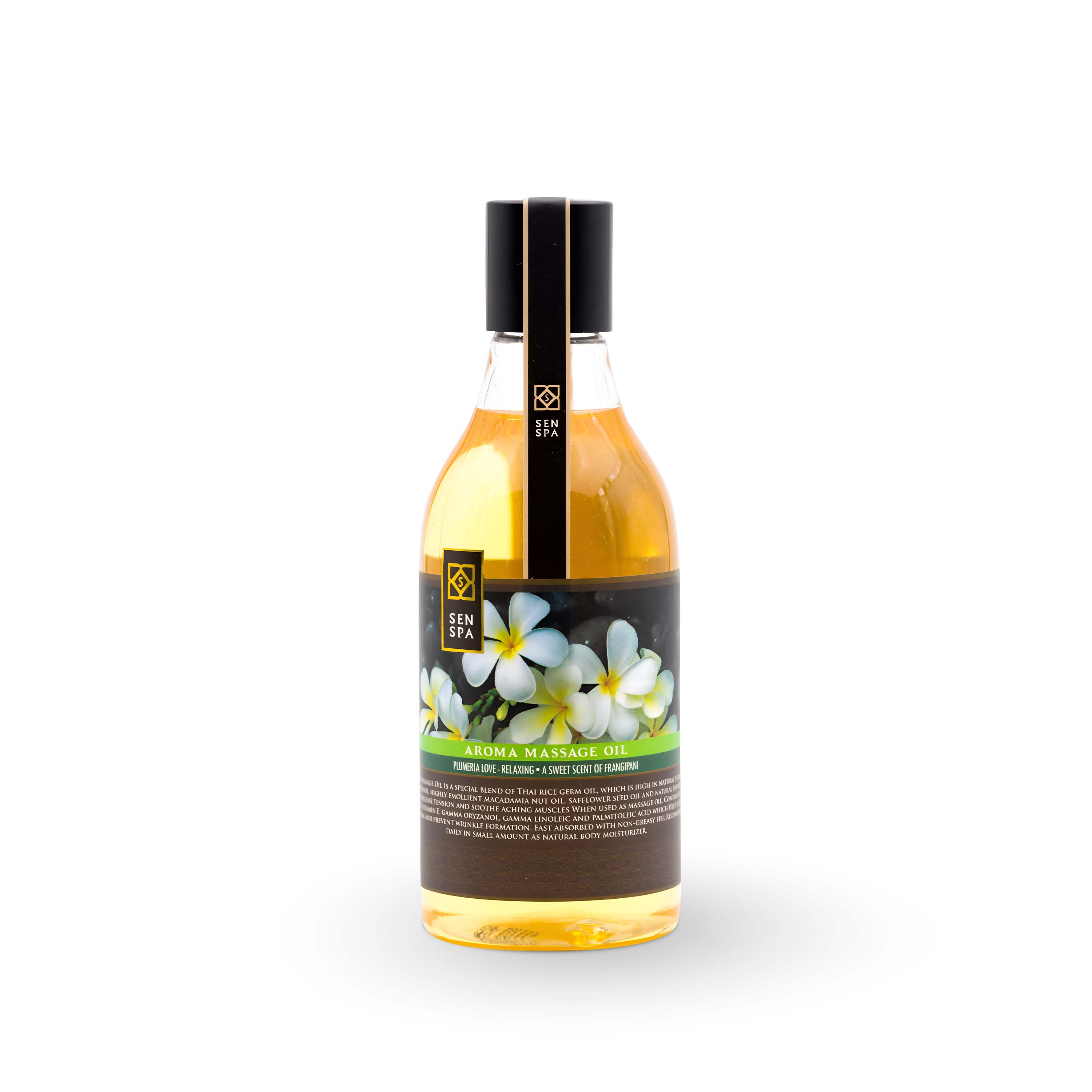 Ароматическое массажное масло SenSpa состоит из смеси тайского масла, добытого из проростков риса, смягчающего масла ореха макадамии, масла семян подсолнечника и натурального тайского масла лемонграсса. Использование такого состава в массаже помогает снять напряжение и успокоить ноющие мышцы. Масло содержит антиоксидант витамин Е, гамма-оризанол, гамма-линолевая и пальмитолеиновая кислоты, которые помогают коже восстановить тонус и предотвратить образование морщин. Масло быстро впитывается и не оставляет жирных следов. Его также можно использовать ежедневно в небольшом количестве в качестве натурального увлажняющего средства для тела.