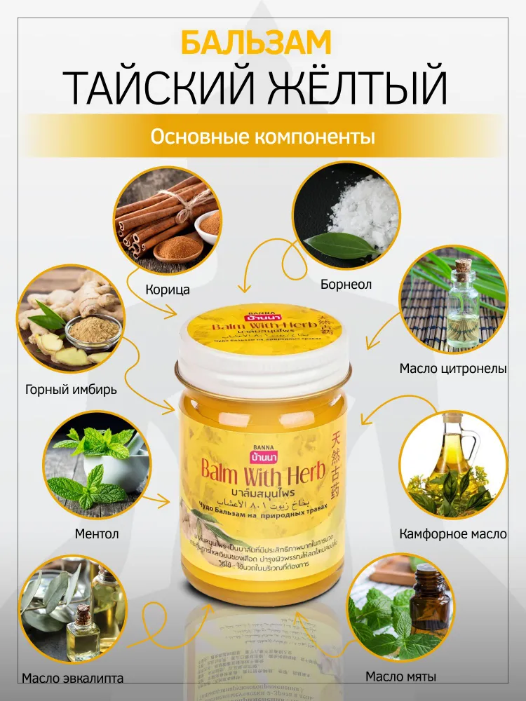 Тайский желтый бальзам — согревающее средство на основе лечебных трав и растительных компонентов. Желтый бальзам с имбирем эффективен для разогрева и подготовки мышц к спортивным нагрузкам, подходит для массажа.